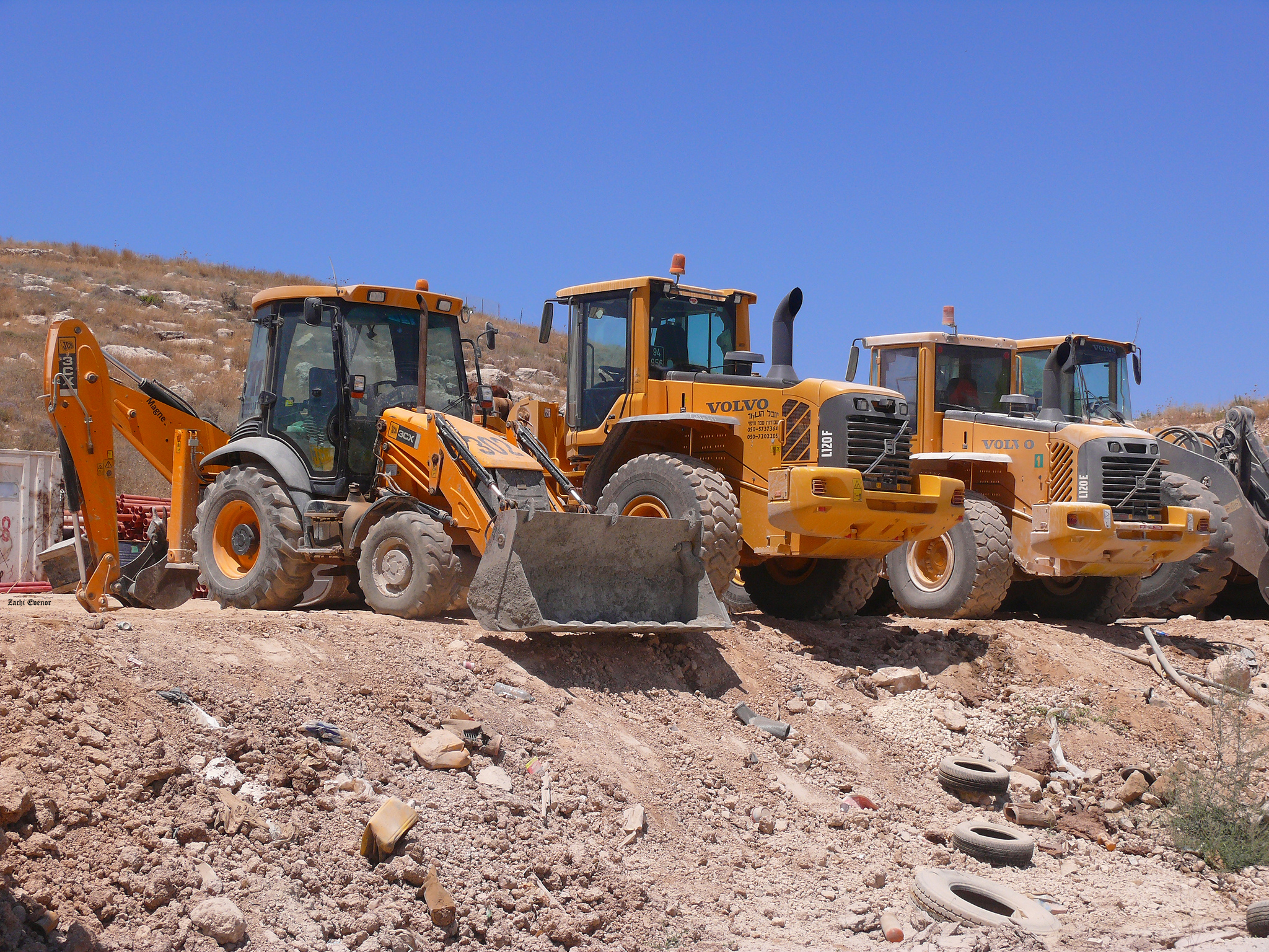 The construction vehicles pictured above are a JCB 3CX (on the left), manufactured in Rocester, UK, and two Volvo Construction Equipment machines (on the right), a L120F and L120E, both manufactured in Arvika, Sweden. My point of course – in