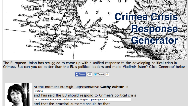 See if you can do better than Ashton, Sikorski and Bildt in the new Crimea Crisis Response Generator (based on the earlier Ashton Sentence Generator and Euromaidan Generator).