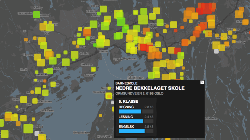 The idea is simple, the map is stylish and easy to read, and the code is open source – welcome to skoleporten, the interactive map of Norwegian school results for junior schools (5th grade) and secondary schools (8th grade), produced by Evan Westvang, one of the programmers at Origo.no. More details on the Origo blog in Norwegian here. Sizes of squares represents size of schools, and colour represents how well they’re doing.