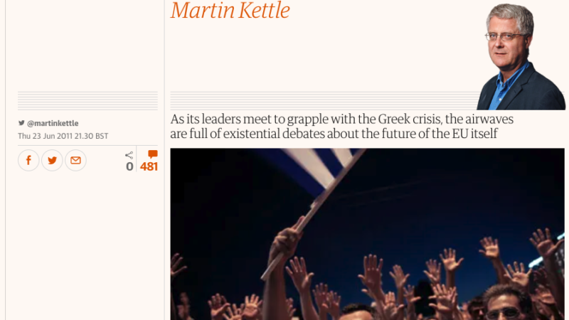Martin Kettle has penned a piece in today’s Guardian entitled “Greece, Schengen, Nato – it’s time to admit the European dream is over“. It’s the latest in a series of pieces that are appearing a lot in the UK press at the moment – whatever the UK’s own headaches about the deficit, cuts etc., we can look on smugly from the side. If the European dream crumbles, well, so be it, because it was never a dream really, was it.