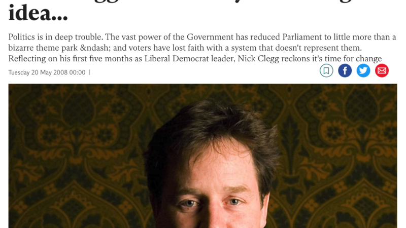 ‘Well, he would say that wouldn’t he’ will surely be the reaction (if anyone does bother reacting) to Nick Clegg’s article in today’s Independent about the state of British democracy. But just read it. British politics is archaic, out of touch, and badly in need of reform (as I’ve previously argued), and Clegg has some reasonable ideas about how to fix things. The stats on elections and voting, and the part about fiscal responsibility is particularly interesting. I sadly fear neither of the two main parties is going to listen to any of this, but credit to Clegg for a coherent and principled approach.