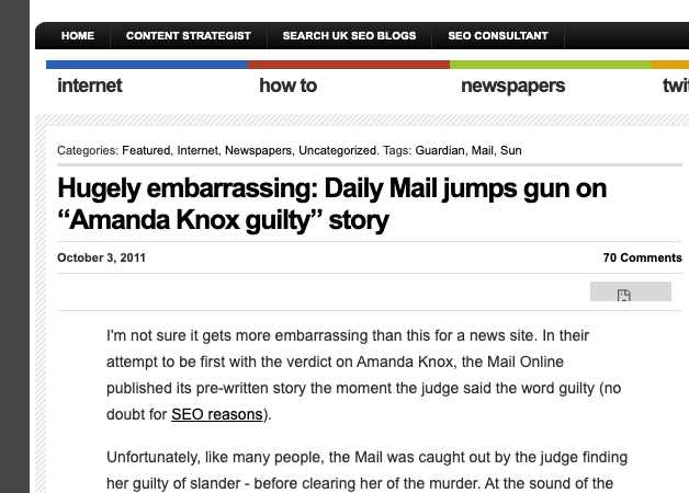 A quite incredible failure of journalism overnight from Nick Pisa, journalist of the Daily Mail, writing a piece saying Amanda Knox was guilty of murder when she was actually innocent. More on the issue from Malcolm Coles and Anna Raccoon.