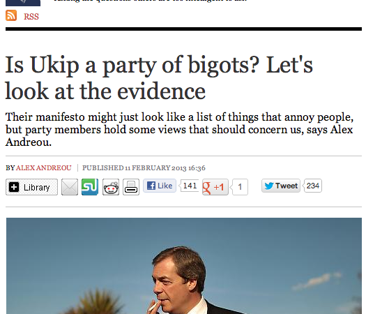 Alex Andreou has had a go at UKIP on the New Statesman website. It’s a detailed, but relatively standard, attempt to critique the party – that they have no coherent, let alone costed, policies, and that many of the people in the party or associated with the party are either nasty or mad or both. I do not disagree with either of these broad points, but I wonder whether attacking UKIP in this way actually works as a means of opposition.