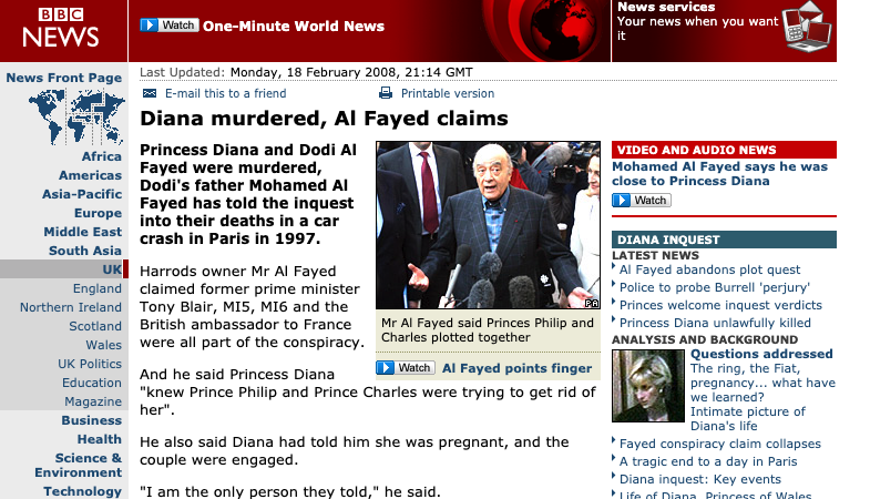 So Mohammed Al Fayed has had his say at the Diana inquest and he stands by his opinion that the car crash was organised by the UK intelligence services at the request of Prince Philip. All kinds of people are part of the stitch up: Tony Blair, Mi5, Mi6, the then British Ambassador to France Sir Michael Jay… The list goes on and on. Now I personally think he’s round the twist to want to even believe in this conspiracy, but people will believe what they wish to believe.