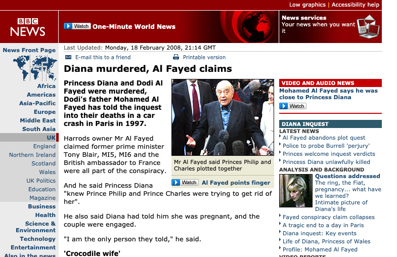 So Mohammed Al Fayed has had his say at the Diana inquest and he stands by his opinion that the car crash was organised by the UK intelligence services at the request of Prince Philip. All kinds of people are
