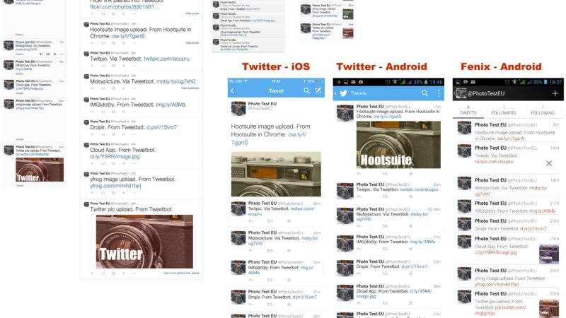 I registered the Twitter account @PhotoTestEU and tweeted pictures using that account. I included pictures from Twitter’s own image uploading system, yfrog, CloudApp, Droplr, img.ly, Mobypicture, and Twitpic (for comparison) – these are all the image uploading options in Tweetbot for Mac, my favoured Twitter client. I additionally tweeted a pic from Hootsuite, and pasted in links to pictures first uploaded to Flickr and Instagram.
