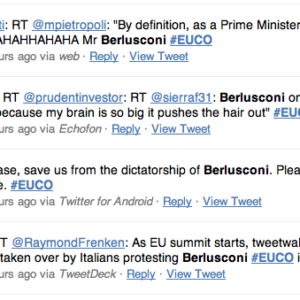 The screenshot above shows the oldest results from search.twitter.com for “EUCO Berlusconi”, and explains how the Twitterwall story started (I’ve previously posted about here and here). Just to set the record straight this is exactly what happened. First, I realised that tweets containing #EUCO would appear on the Twitter wall,...