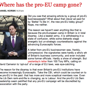 Daniel Korski has written a short piece at Spectator Coffee House entitled Where has the pro-EU camp gone? It’s a valid question to ask, if you view UK politics along the traditional lines of pro-EU versus anti-EU. The problem is that very frame only gets you so far. Korski rightly...
