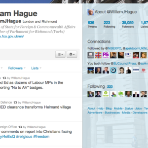 The screenshot above was taken at 1719 today, showing William Hague’s Twitter account, @WilliamJHague. It’s worth noting the three tweets present at the top, shown in more detail here: The first tweet is explicitly party political, while the second and third are retweets of governmental business. The Hague account states...