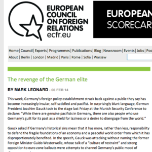 Perhaps I’m overdoing it, but I’m not a fan of the way Mark Leonard’s recent ECFR column is titled. “The revenge of the German elite” he writes, documenting concerted efforts by Bundespräsident Gauck, and ministers Steinmeier and von der Leyen. The basic gist of the piece is that the German...