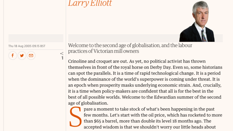 There’s a very lucid and internally coherent column in today’s Guardian from Larry Elliott entitled Edwardian Summer, drawing parallels between today’s economic stuggles (oil prices, flexiblility, worker backlash etc.) and the period pre-1914, the first era of globalisation. You have to take what Elliott says with a pinch of salt – his opposition to the Euro is well know for example. Further, his column is effectively a stream of criticism and proposes little in the way of solutions. It’s well worth 10 minutes of your time to consider his arguments.