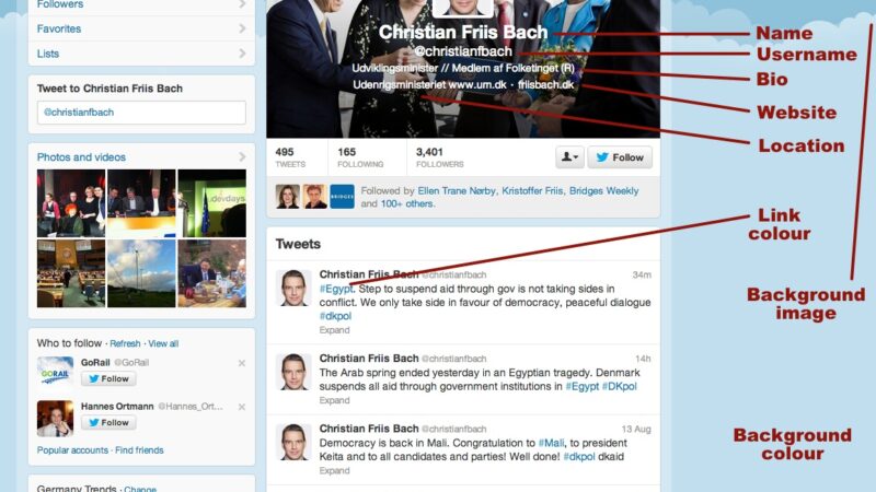 Danish Minister for Development Cooperation Christian Friis Bach has been coming in for some heavy criticism today on Twitter (his account is here) for his statements about Danish aid to Egypt. As a result I looked at his Twitter profile for the first time for some months and it’s quite awful. But Friis Bach is not the only one – many politicians’ Twitter profiles leave a lot of room for improvement. So here’s a guide as to what should go where, and what’s important and less vital, using Friis Bach’s account as an example.