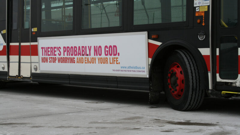 Contrast that with the Canadian atheist bus campaign that is now running (bus and subway ads are already in Toronto). When the first press stories about the Canadian campaign appeared they complained on their website (text subsequently removed!) that the Canadian press was still using the images of the London buses. Well folks, at that stage there were no images at all – not even mockups – of the Candian buses. So no surprise then! There are now some images on Flickr, and one is shown above, but the max resolution for download is still only 1024×768 pixels. The same is now happening with the French language campaign in Montréal – this is the only image I can find of a Montréal bus and that’s not close to adequate quality for anyone to use.
