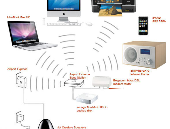 18 months ago I wrote a post about how I reckoned I had the ultimate home Mac network. Of course times change and things move on… so now I have the ultimate home network version 2.0. Why the change? Essentially I’ve moved flat and wanted to put all the tech in the places I wanted it around my flat, rather than just where the wires were. The diagramme above is what I’ve come up with, with basically everything running wirelessly. I’ve also added a few extra bits of smart tech since the original network was created.