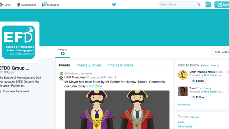 The @EFDDgroup one was more subversive, and it was not clear that I had registered the account. The account uses a similar logo and colour scheme to the EFDD Group in the European Parliament, but – really – who thinks that “The Europe of Fruitcakes and Daft Demagogues” is actually the real group? Anyway, someone in the group in the EP complained and got it suspended.